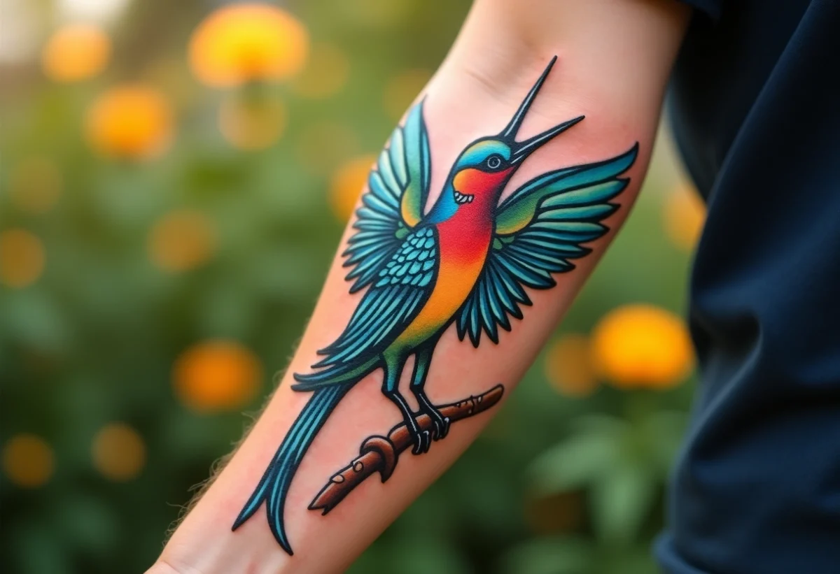 Le tatouage colibri se décline en une multitude de styles, chacun apportant une touche unique à ce symbole. Parmi les variations les plus populaires, on trouve le tatouage colibri aquarelle. Cette technique se caractérise par des couleurs vives et des contours flous, créant un effet de peinture fraîche qui rappelle la légèreté et la vivacité de l’oiseau.